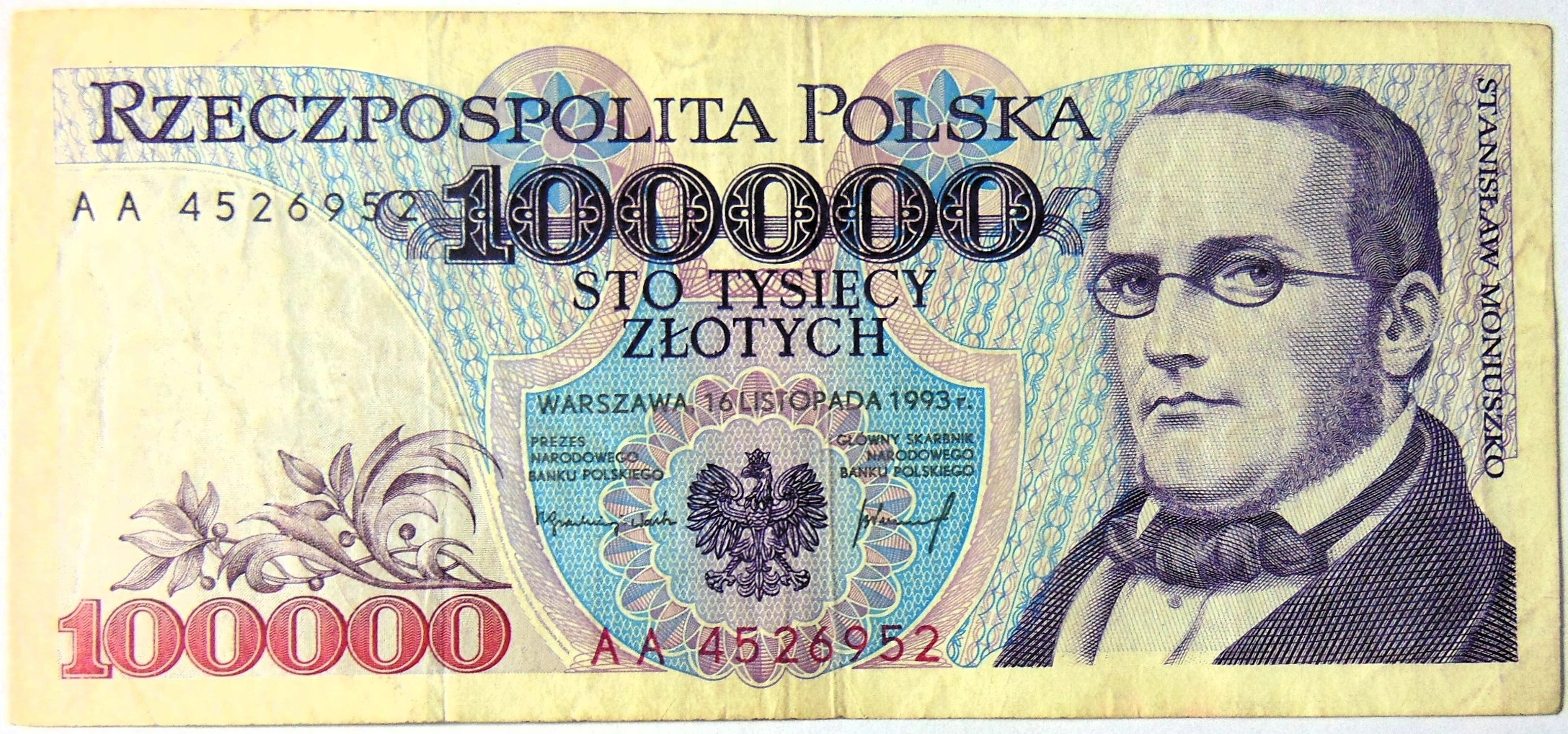 1993 100000 zł złotych Moniuszko seria AA. Oryginał. SPRAWDŹ INNE AUKCJE - KOLEKCJONUJ RZADKIE WALORY Z NUMIZMATO!